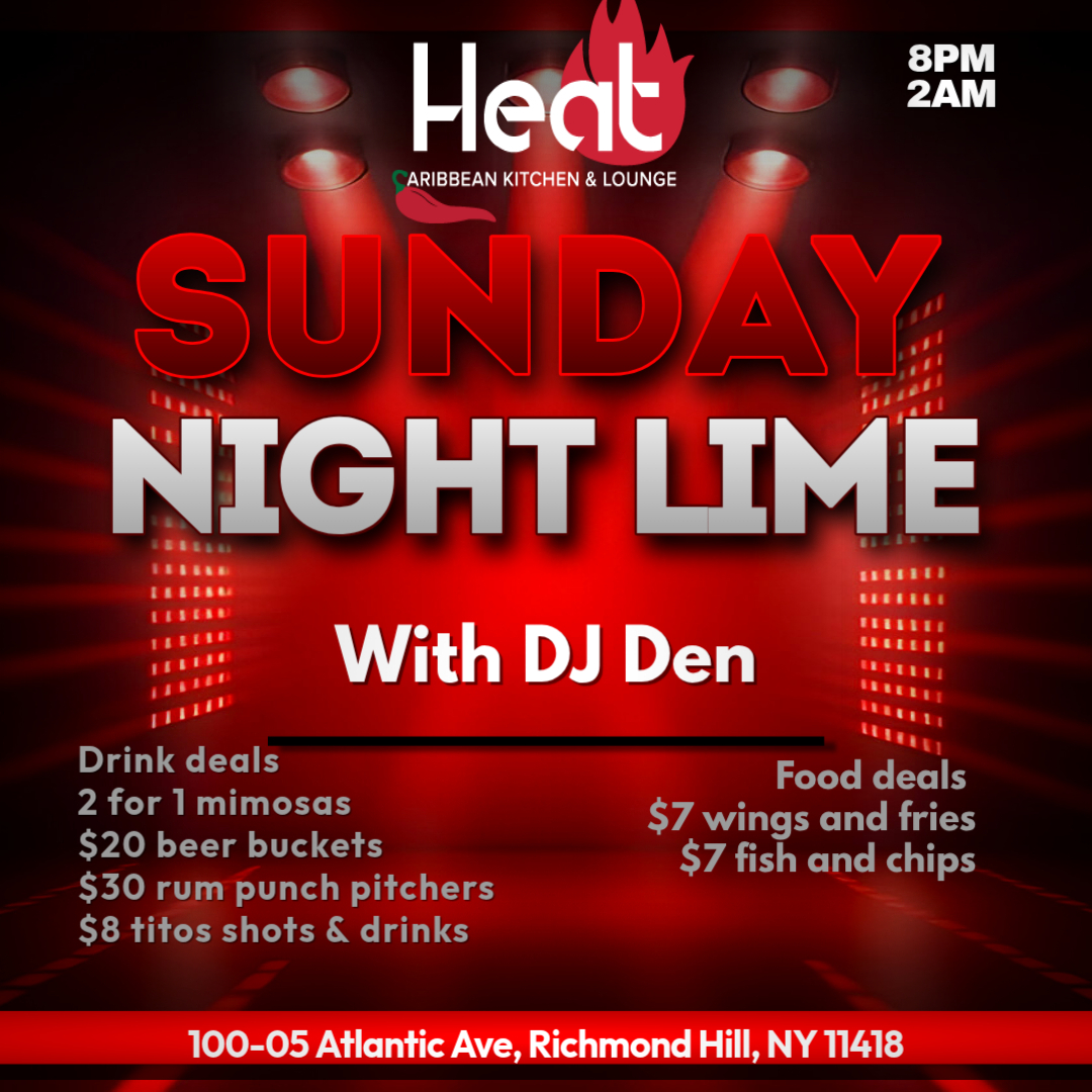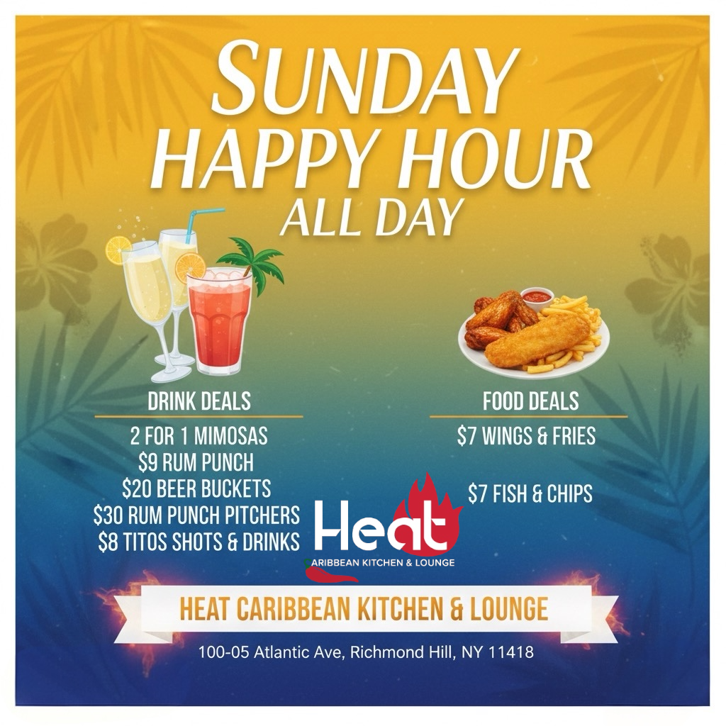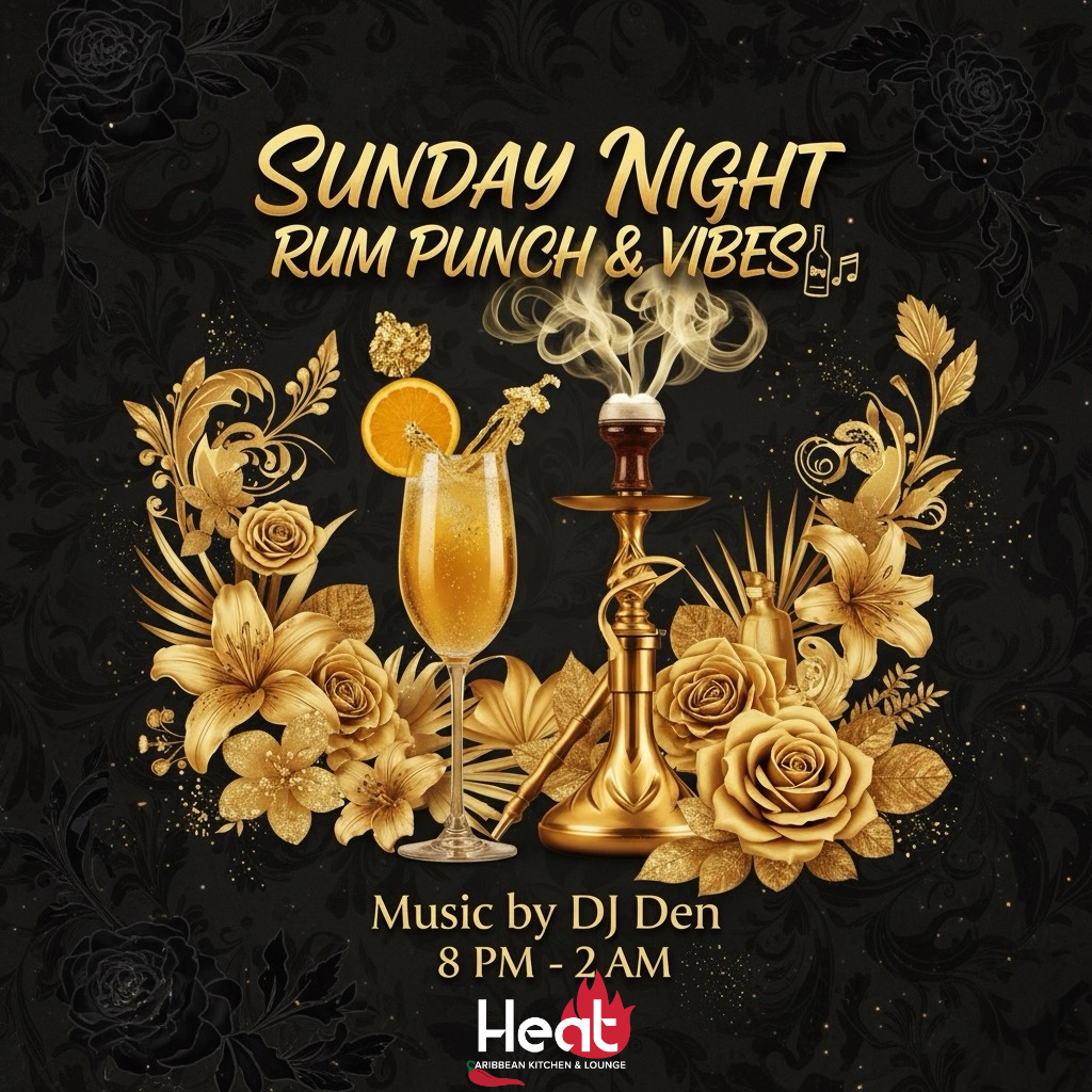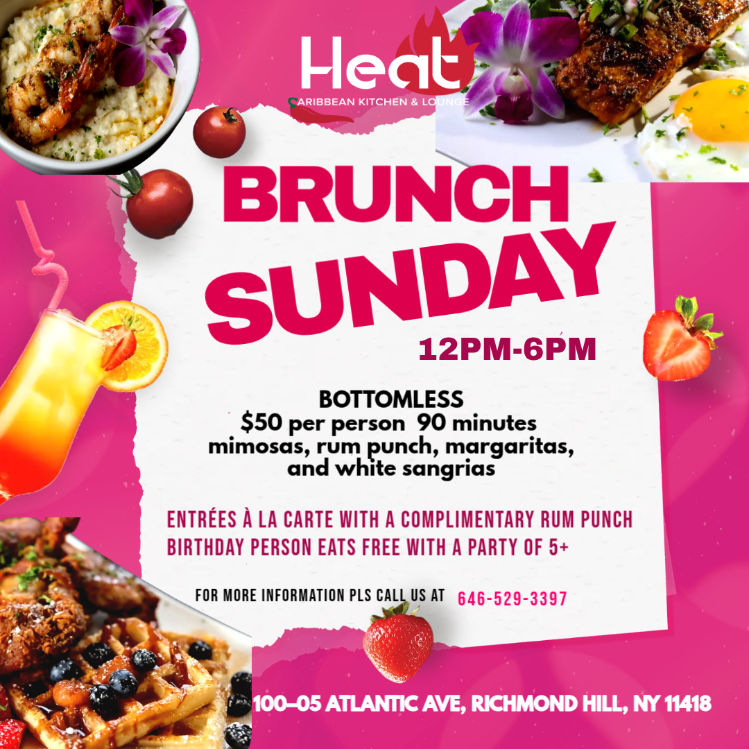 Sunday brunch 12-6 PM featuring mouthwatering favorites, jerk chicken or shrimp curry roti wraps, chicken & waffles, steak and eggs and dishes with the Caribbean flair.