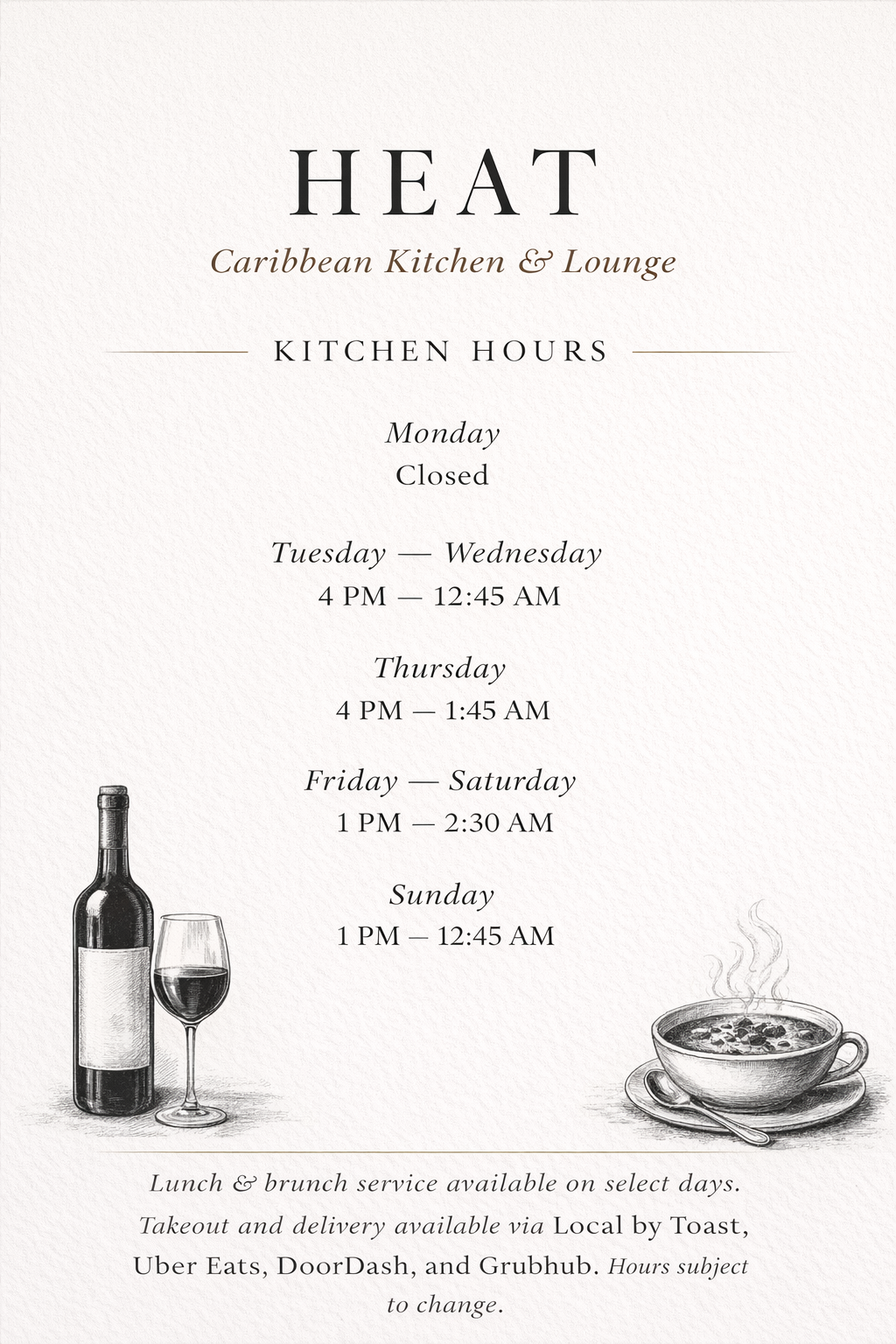 All are welcome at Heat. Sit down and spend time with friends and family in our exciting and fun environment. Food is made fresh at the time of order, from reimagined modern Caribbean food to amazing chow mein (a Heat specialty) there is something delicious for everyone