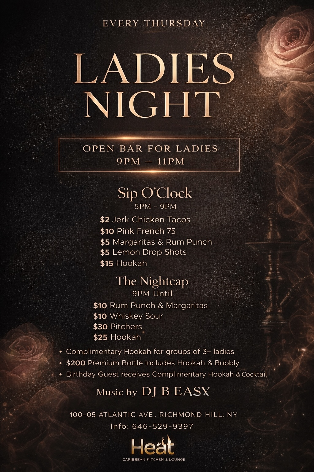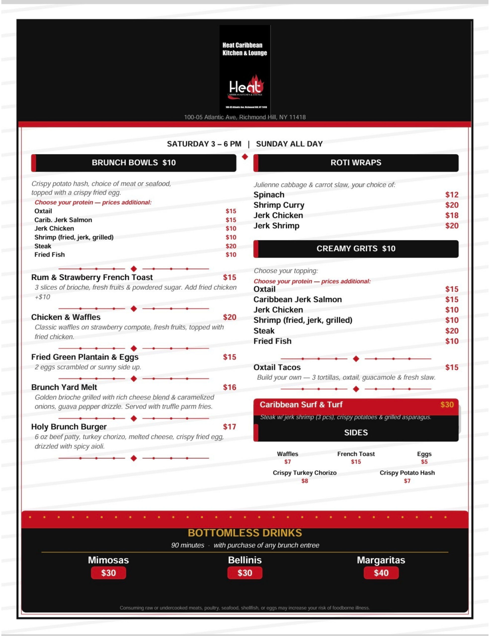 Brunch Saturday 2-6 PM, Sunday -all day 12-6 featuring mouthwatering favorites, jerk chicken or shrimp curry roti wraps, chicken & waffles, surf and turf. Dishes with the modern Caribbean America flair.